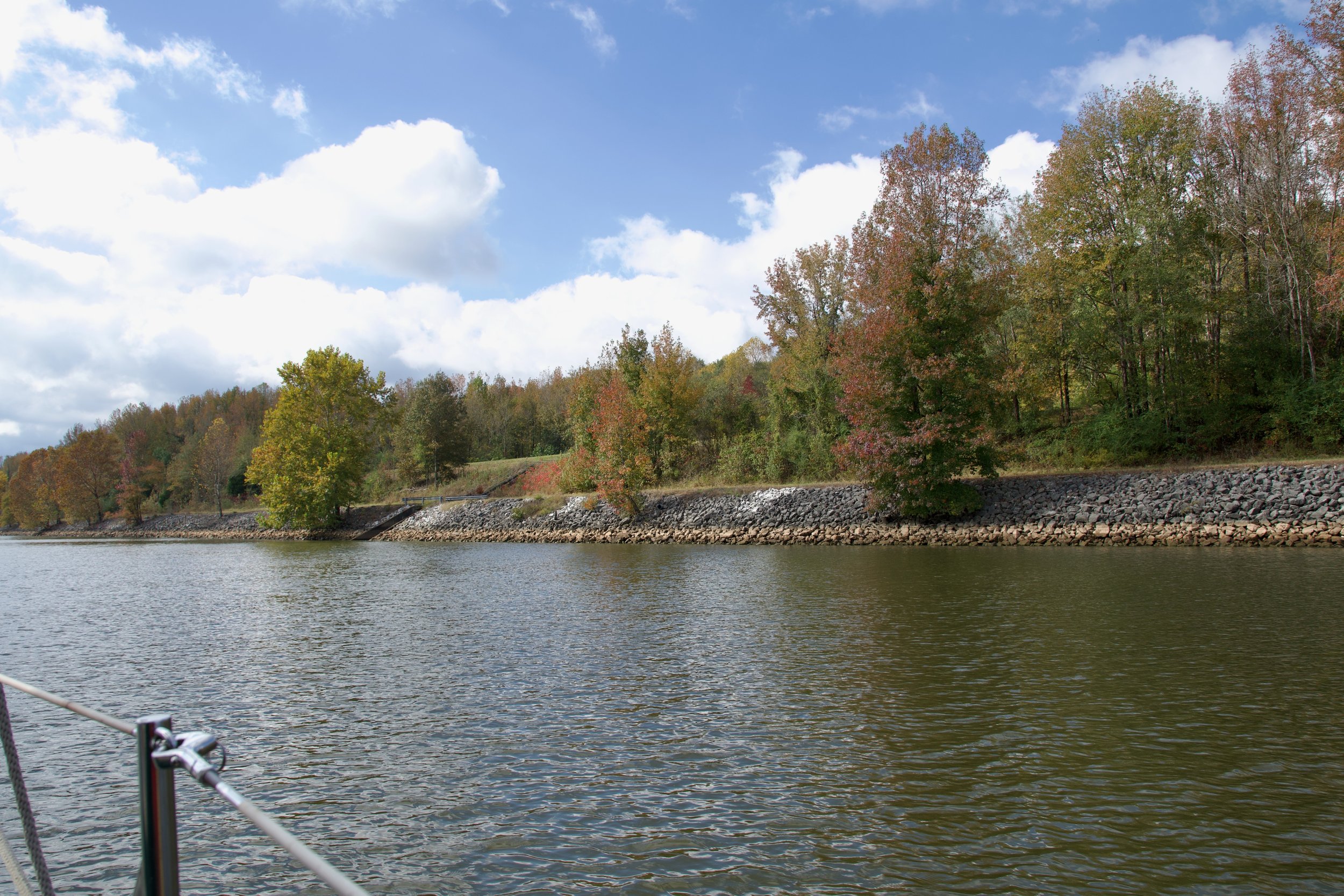 Now I am learning another waterway, the Tennesee-Tombigbee. So far most of its shores have looked much like any other southern riverbank to me. Ongoing lines of evergreen pines and rusty-looking deciduous trees, spotted with the bright clumps of trees showing off the Fall beauty of letting go. As we motor along, we can see where creeks and streams come down from higher ground and join the flow. Now and then we come to a wide place in the waterway, but not enough room to sail. In fact, we have only had one day so far when we actually got to enjoy the natural beauty of being powered by the wind. The Tennesee-Tombigbee is a long journey of motoring. Not our favorite activity.